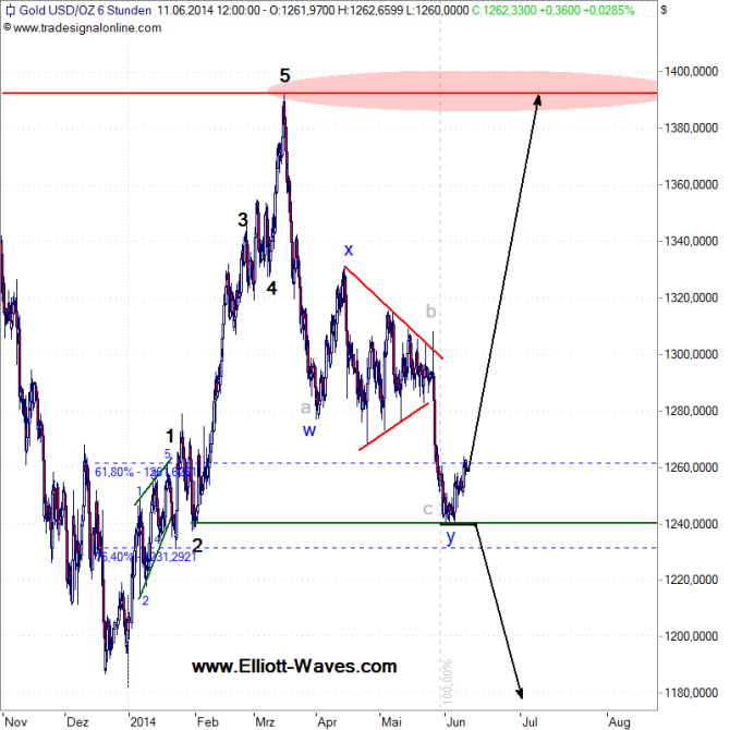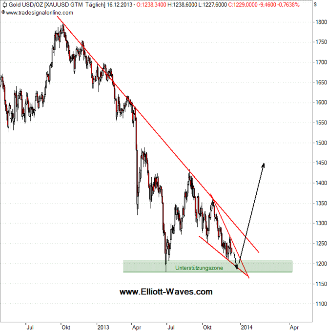 Sollten die 1.240 USD doch noch fallen, bieten sich natürlich die Tiefs von Ende Dezember und Juni 2013 als Kursziel an. 1.000 USD kann ich jedoch selbst aus diesem bärischen Alternativszenario nicht ableiten.