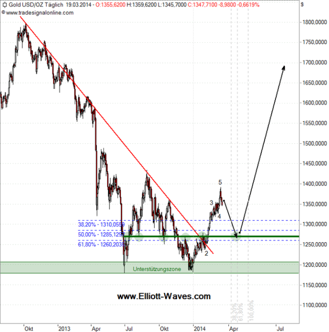 Ich hatte damals ab 1.190 USD einen Gold-Anstieg auf 1.450 USD im 1. Quartal 2014 in Aussicht gestellt. Auf die 1.450 USD warten wir zwar noch heute, jedoch stieg der Goldpreis ab Ende Dezember ab 1.182 USD bis Mitte März relativ zügig auf 1.392 USD.