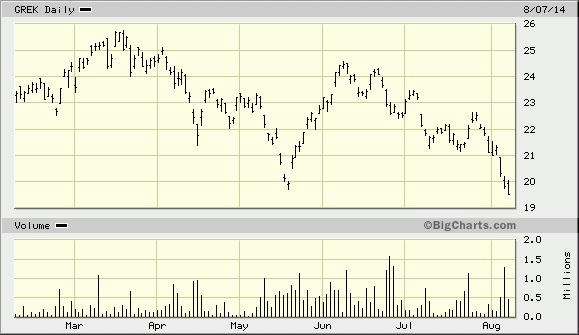 Der MSCI France ETF (EWQ, hier nicht gezeigt) weist auch für Frankreich Schwäche aus. Der ehemalige Star der Weltwirtschaftskrise - sprich Griechenland - zeigt unterdessen wieder neue Anzeichen für Schwäche. Der Greece 20 ETF (GREK), ein Indikator für die Aktienmarktentwicklung des Landes, fiel erst kürzlich auf ein neues Tief für 2014.