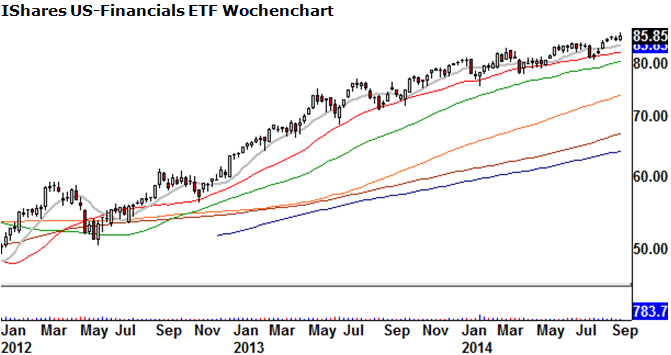 Charttechnisch könnte man an der weiteren Dynamik des Finanzsektors zweifeln. Es sieht nach einer langsamen Ermüdung aus.