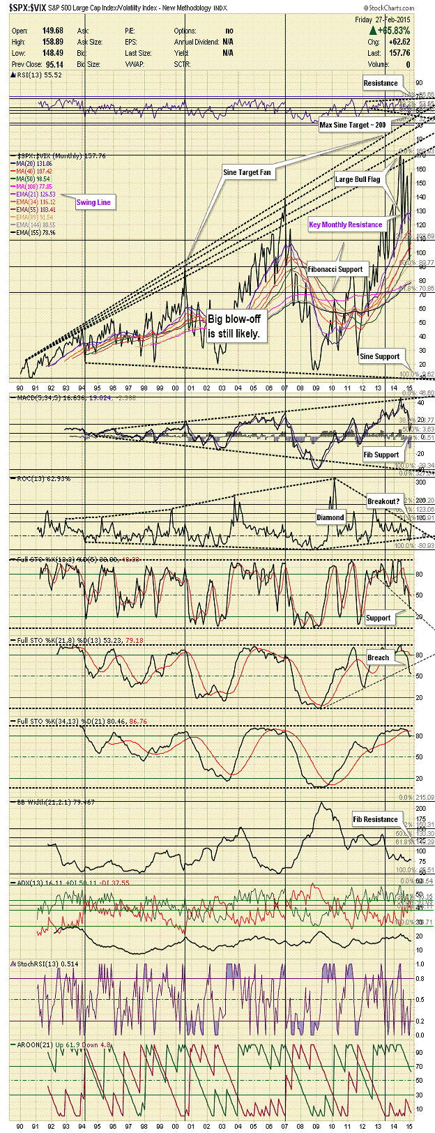 Die Möglichkeit eines Einbruchs im März verdichtet sich also, hier bräuchten wir aber noch steigende Volatilität, um einen definierbaren Top-Prozess im SPX/VIX-Verhältnis (und im SPX) für die kommende Zeit ausmachen zu können. Gleichzeitig muss angemerkt werden, dass dieses Verhältnis zumindest einen Monat am Sinus-Top ausharren muss, damit das Vertrauen gegeben ist, dass die gesamte Energie der übergeordneten bullischen Sequenz aufgebracht wurde. Damit ein solches Signal generiert werden kann, müssten sich im März also nicht nur die Kurse nach oben quälen, sie müssten dort auch bis in den April hinein bleiben. (Siehe Abbildung 2)
