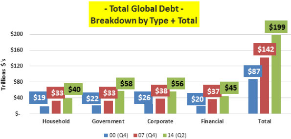 1982 startete ein neuer, disinflationärer Bullmarkt in Aktien, Anleihen und später auch in Immobilien. Jedes mal, wenn der Aktienmarkt krachte, reduzierte das Fed und andere Notenbanken die kurzen Zinsen und kreierte Liqudität. Und es funktionierte jedes Mal: die Aktien stiegen wieder und die Anleihen stiegen weiter. Seit dem großen Krach von 2008 hat alleine das Fed 3.200 Milliarden US$ gedruckt und damit Anleihen aller Art gekauft. Die weltweiten Kredite stiegen laut einer Studien von McKinsey auf 199 Trillionen US$ (199.000 Milliarden), 57 mehr als 2007 und 112 mehr als 2000 (Grafik 4).