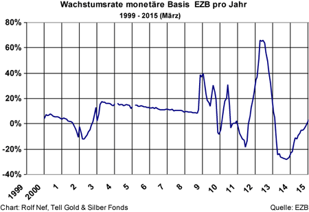 Obwohl die EZB ein QE gestartet hat, ist die Wachstumsrate der monetären Basis noch sehr tief und die Anleihenmärkte haben dieses QE mit negativen Zinsen längst diskontiert (Grafik 5). Nur Japans Basis wächst mit 40%, aber es hat auch eine Staatsschuldenblase von 40% vor dem Platzen zu schützen.