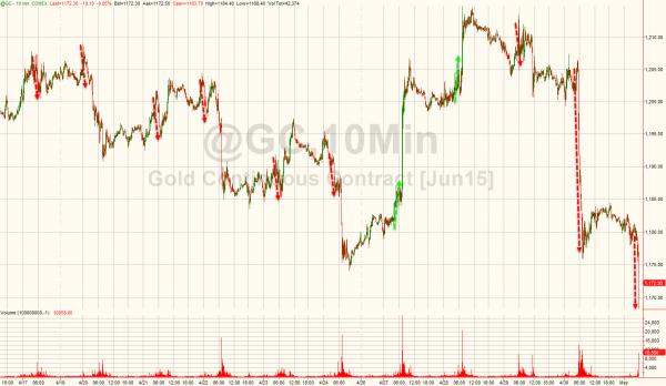 Zum gestrigen Goldpreissturz schreibt Zerohedge: "Um 8.34 Uhr östlicher Zeit entschied jemand ´Besonderes´, dass es die perfekte Zeit war, für 590 Mio. $ Goldfutures zu verkaufen..."