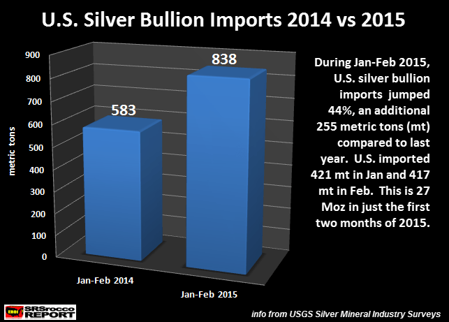 Im Januar und Februar 2015 importierten die Vereinigten Staaten 838 t an physischem Silber, verglichen mit 583 t im letzten Jahr. Ich wies jedoch ebenso darauf hin, dass die Silbernachfrage im ersten Quartal 2015 entweder stagnierte oder niedriger lag als im Vorjahr. Wozu benötigt der amerikanische Silbermarkt also zusätzliches Silber, wenn die Nachfrage gesunken ist? Wer kauft all das Silber … und warum?