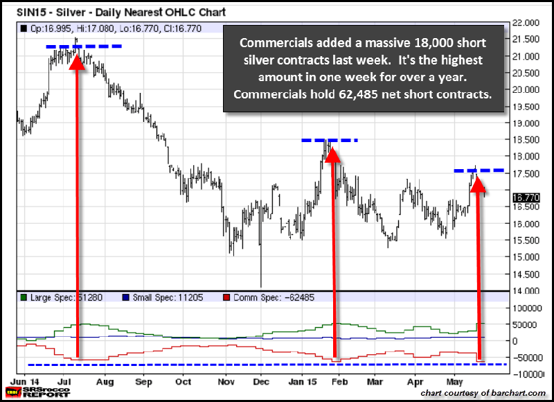 19. Mai 2015 - Netto-Short-Positionen der Banken = 62.485 - höchster Silberpreis = USD 17,74