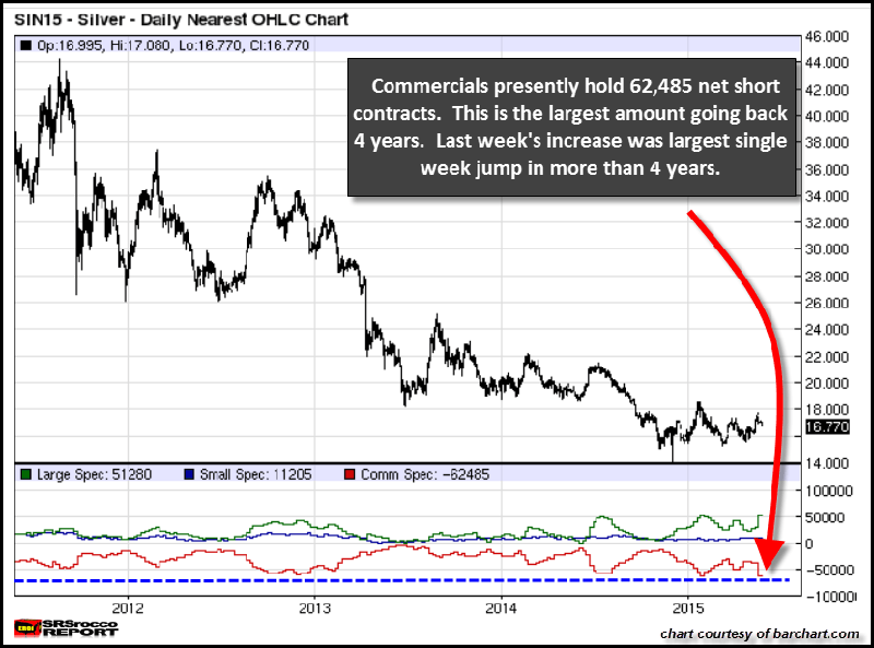 Die ROTE LINIE unter der Silberpreiskurve im Chart stellt die Änderungen der Nettoanzahl der Short-Positionen der Geschäftsbanken dar. Sie werden bemerken, dass diese Änderungen in der Vergangenheit kleiner ausfielen. Die rote Linie ändert sich stufenweise, entweder nach oben oder nach unten, und meist vollziehen sich die Änderungen in kleinen Schritten. Letzte Woche ging es jedoch mit zusätzlich 24.362 Short-Verträgen netto einen großen Schritt nach unten.