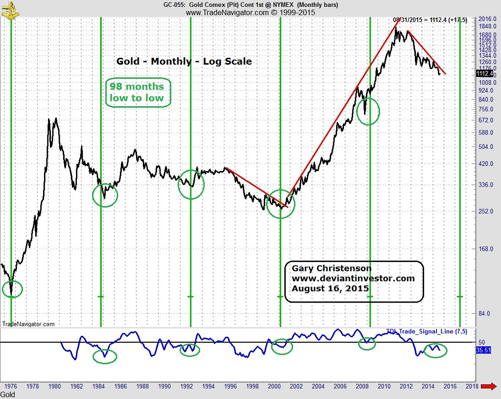In den letzten 40 Jahren wurde der Goldpreis natürlich in alle Richtungen manipuliert, aber ich denke, wir können uns zumindest darauf einigen, dass die historischen Preise Fakten sind. Betrachten Sie die logarithmische Goldpreiskurve im untenstehenden Chart, die die Kursentwicklung der letzten 40 Jahre abbildet, und die vertikalen grünen Linien, die alle 98 Monate bzw. ungefähr alle acht Jahre eingezeichnet sind. Sie markieren die Zeitpunkte wichtiger Tiefpunkte, die etwa im Abstand von acht Jahren eingetreten sind.