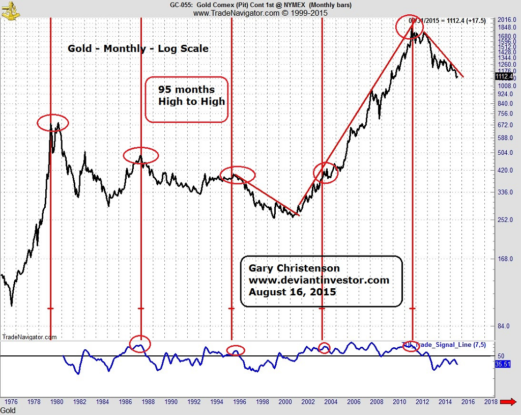 Der folgende, ähnliche Chart zeigt die Spitzen des Goldkurses. Die vertikalen roten Linien sind hier im Abstand von 95 Monaten, also ebenfalls etwa acht Jahren, eingezeichnet. Auch die Preisrekorde stellten sich ungefähr einmal in acht Jahren ein.