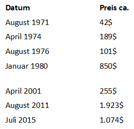 - Zwischen August 1971 (als Präsident Nixon die Golddeckung des US-Dollar "vorübergehend" aufhob) und April 1974 stieg der Goldkurs um das 4,5fache. Anschließend fiel er innerhalb von zwei Jahren und vier Monaten um etwa 47%.