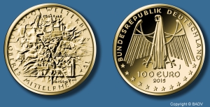 Die 100-Euro-Goldmünze UNESCO Welterbe – Oberes Mittelrheintal wird vom 1. Oktober 2015 an durch die Verkaufsstelle für Sammlermünzen der Bundesrepublik Deutschland in 92626 Weiden ausgeliefert.