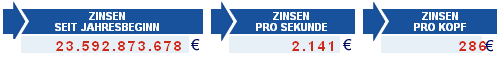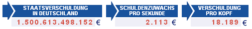 Am vergangenen Freitag, 05. Mai 2006 überschritten die öffentlichen Hände die Verschuldungsmarke von 1,5 Billionen Euro. Laut Schuldenuhr des Bundes der Steuerzahler, verschulden wir uns weiterhin mit 2.113 Euro je Sekunde, d.h. 182,5 Millionen Euro pro Tag.Gleichzeitig tickt die Zinsuhr laut Steuerzahlerbund bereits mit 2.141,- Euro je Sekunde: