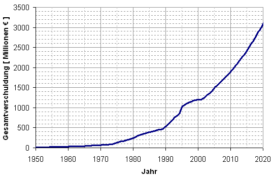 D.h. die Zinsen ticken bereits schneller wie die Schulden. Nehmen wir rein mathematisch an, dass in Zukunft weiterhin die Zinslast von - angenommen - 5% der bestehenden Schulden durch neue getragen werden müssen, so ergibt sich folgende Kurve.