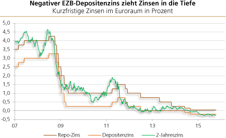 Der negative EZB-Depositenzins zieht gewissermaßen die Marktzinsen für Anleihen (vor allem die mit relativ kurzen Laufzeiten) in die Tiefe, drückt folglich das Zinsumfeld auf die Nulllinie oder sogar darunter.