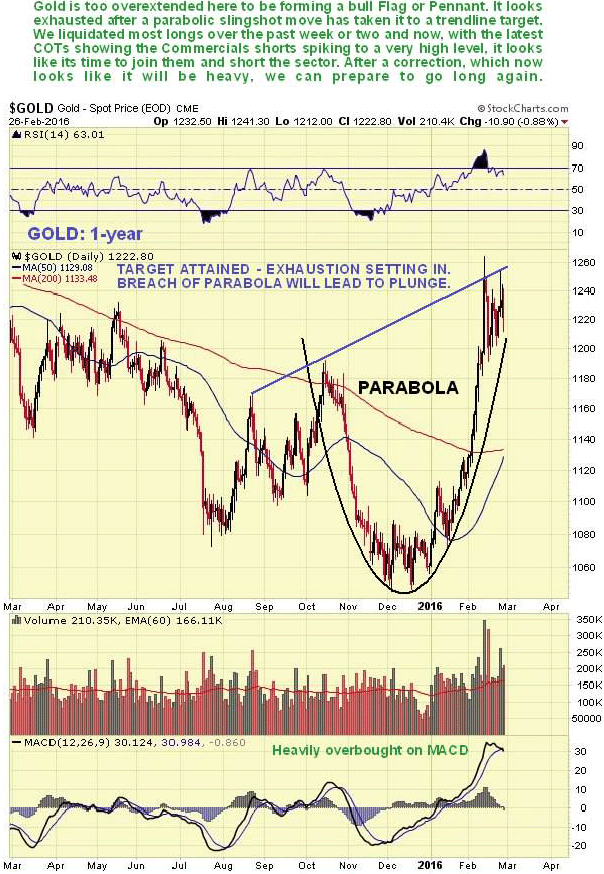 In meinen letzten Updates zum Gold- und Silbermarkt, die am vergangenen Wochenende veröffentlicht wurden, äußerte ich die Ansicht, dass der Goldkurs und der Silberkurs ein zwischenzeitliches Top bilden, und nicht, wie teilweise angenommen wurde, ein bullisches Flaggen-Muster. Die Daten des neusten Commitment of Traders Report bestätigen diese Theorie nicht nur, sondern signalisieren auch einen kurz bevorstehenden, deutlichen Kurseinbruch. Für Silber ging es am Freitag bereits abwärts. Glücklicherweise haben wir den Großteil unserer Long-Positionen im Edelmetallsektor im Laufe der letzten beiden Wochen liquidiert - viele davon mit einem hübschen Gewinn - weil wir die Gefahr erkannt hatten.Der aktuelle Jahreschart für Gold sollte denjenigen eine Warnung sein, die in diesem Sektor noch long sind. Er zeigt, dass der Goldpreis zunächst parabolisch gestiegen ist, bis ein Kursziel erreicht wurde und Gold stark überkauft war. Seitdem entwickelt sich das Edelmetall seitwärts und scheint anfällig für eine Gegenbewegung, die insbesondere in Anbetracht des COT-Reports recht heftig ausfallen könnte. Wenn der Kurs von der Parabel aus einbricht, wird er wahrscheinlich dramatisch in die Tiefe stürzen.