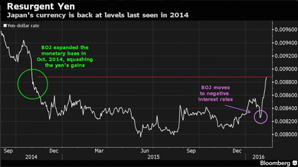 Der insbesondere seit der Finanzkrise verbreitete Glaube, dass die Notenbanken quasi omnipotent seien und sich sämtliche Finanzprobleme via Gelddrucken oder Negativzinsen in den Griff bekommen ließen, erhielt im Februar mehr als einen deutlichen Dämpfer. So verfehlte die Erklärung des japanischen Notenbank-Chefs Kuroda Ende Januar, nun ebenfalls in das bis dato allein europäische Negativzinsexperiment einzusteigen, die erhoffte Wirkung komplett. Statt der noch vor Monaten bei jeder Ankündigung einer Intensivierung der geldpolitischen »Lockerungsübung« reflexartig üblichen fulminanten Aktienkursgewinne brachte der Februar rund 10% Verlust für die Nikkei 225-Investoren, während der Yen - statt erwartungsgemäß abzutauchen - zum Entsetzen der japanischen Währungskrieger einen absurden Aufwertungscrash erlebte. Was für ein Fiasko!