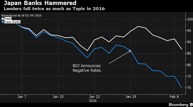 Insbesondere der dramatische Verfall der japanischen Bankaktien seit Jahresanfang und deren nochmaliger Einbruch nach der BoJ-Negativzinsankündigung zeigen deutlich, dass das Ansinnen der Zentralbankbürokraten, die Banken ohne jegliche Rücksicht auf die schon heute heillos überschuldete Realwirtschaft via Strafzinsen zu ihrem Kreditvergabe-(Un)Glück zu zwingen, zu einem planwirtschaftlichen Rohrkrepierer geworden ist.