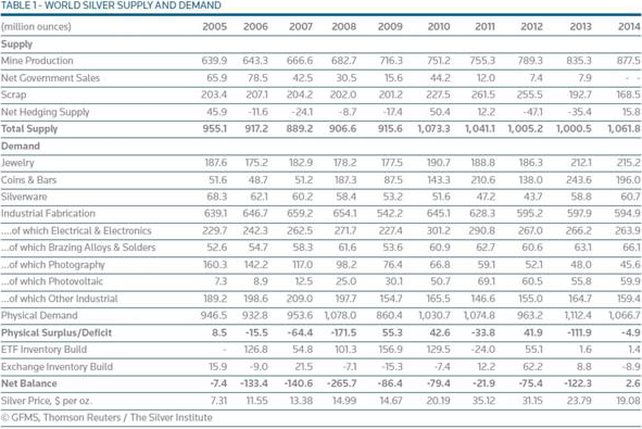 Angebot und Nachfrage nach einer Anlageklasse bestimmten langfristig gesehen deren Preis. Die folgende Tabelle vermittelt eine Vorstellung vom Angebotsdefizit, welches im letzten Jahrzehnt am Silbermarkt herrschte. Mit Ausnahme von 2014 überstieg die Nachfrage nach dem weißen Metall in jedem Jahr das Angebot. Obwohl das Angebot im Laufe der letzten zehn Jahre insgesamt zugenommen hat, ist auch die Nachfrage im gleichen Maße gestiegen.