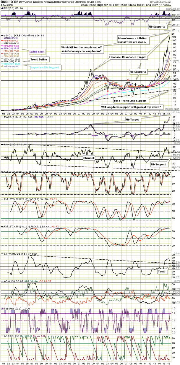Die gleichen an das Sentiment gekoppelten Gegebenheiten, die dafür sorgen, dass die allgemeinen Aktienmärkte immer weiter steigen, treffen jetzt auch auf die Edelmetallaktien zu - die Algorithmen und Computer, die den Hochfrequenzhandel abwickeln, arbeiten nun zu Ihren Gunsten. Das Dow/CRB-Verhältnis hat das Fibonacci-Ziel schon fast erreicht. Wenn es dort angelangt ist und wieder zu fallen beginnt, wird das den Edelmetallen weiteren Auftrieb verleihen, weil dann auch künftige Inflationserwartungen mit eingepreist werden sollten.