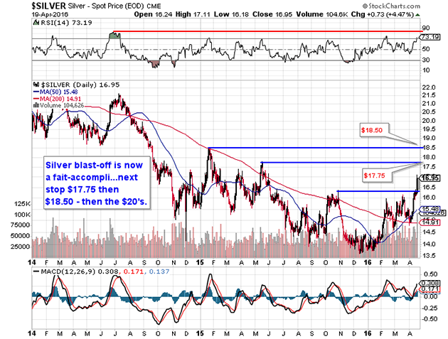 Glücklicherweise war meine Entscheidung, sofort Silber zu kaufen, statt auf die unvermeidliche Korrektur des Acra Gold BUGS Index HUI zu warten, genau richtig, da der Silberkurs von 15,20 US-Dollar am 31. März auf das heutige Hoch von 17,11 Dollar gestiegen ist und damit innerhalb von weniger als drei Wochen 12,5% zulegte. In diesem Zusammenhang hat es mit Sicherheit nicht geschadet, dass die Deutsche Bank gezwungen war, die ausufernde Verschwörung zur Manipulation der Edelmetallpreise zuzugeben und nebenbei auch die Scotiabank und die HSBC zu belasten, doch der Silbermarkt machte auch schon lange vor der Aufdeckung dieses gigantischen Betrugs den Eindruck, als stünde ein sprunghafter Kursgewinn bevor (siehe Chart unten).