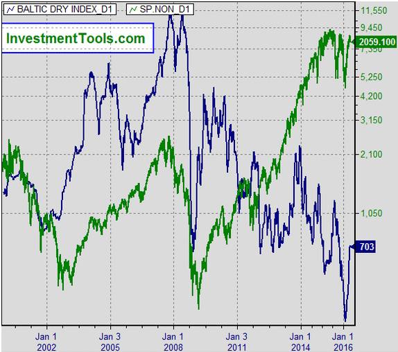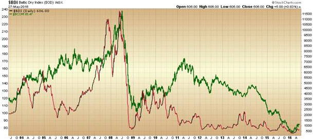 Es ist offensichtlich, dass der BDI sowohl zum Bloomberg Commodity Index (BCOM) als auch zum Commodity Research Bureau Index (CRB) eine Korrelation aufweist. Die Nachfrage nach allen Rohstoffen sinkt im Durchschnitt gefährlich ab, während das Handelsvolumen weltweit rückläufig ist. Das impliziert, dass sich am Horizont bereits die Sturmwolken des wirtschaftlichen Ungemachs zusammenbrauen.
