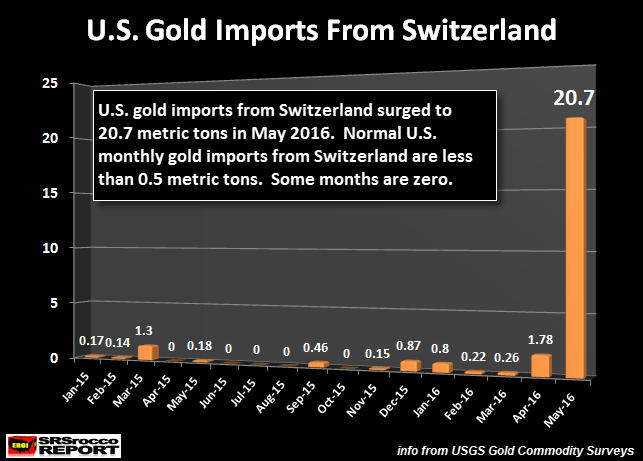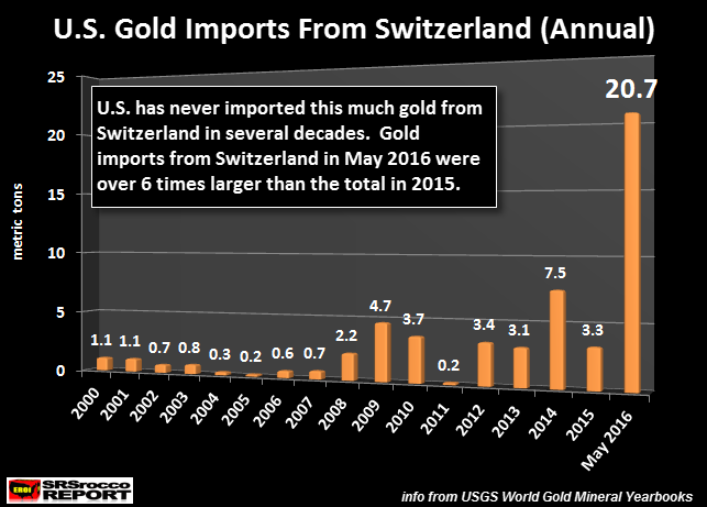 Außerdem haben die Vereinigten Staaten, wie ich schon in früheren Artikeln berichtet habe, mehr Gold exportiert als sie produzieren und einführen. Dies änderte sich jedoch ebenfalls im Mai, als die USA in nur einem Monat mehr Gold aus der Schweiz importierten als sie es in all den Jahren seit dem Jahr 2000 getan haben: