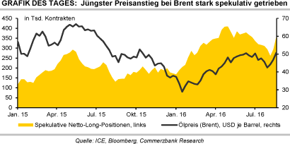 EnergieDer Brentölpreis fiel gestern um mehr als 3% und ist am Morgen unter 49 USD je Barrel gerutscht. WTI verlor 3% und handelte zwischenzeitlich unter 47 USD je Barrel. Der Kontraktwechsel bei WTI führte somit nur kurzzeitig zu einem optischen Preisanstieg. Der Preisanstieg bei Brent um gut 20% seit Anfang August war in erster Linie spekulativ getrieben. Die Netto-Long-Positionen der spekulativen Finanzanleger stiegen in der Woche zum 16. August um 63,2 Tsd. Kontrakte. Das entsprach dem stärksten Wochenanstieg seit Beginn der Datenreihe im Januar 2011.