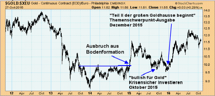 In Euro befindet sich der Goldpreis schon seit Anfang 2014 wieder in einem klaren Aufwärtstrend.