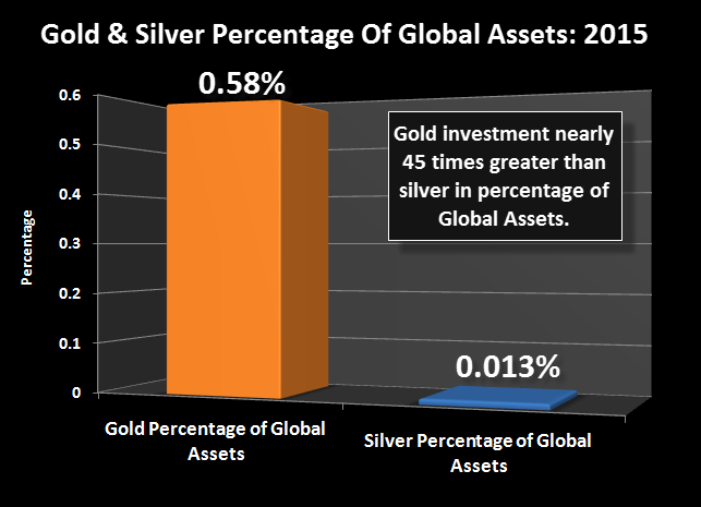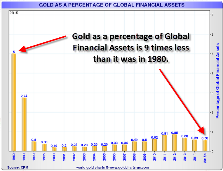 Ab dem Jahr 2001 begann der prozentuale Anteil von Goldinvestitionen an den weltweiten finanziellen Vermögenswerten einen langsamen kontinuierlichen Aufstieg bis zum Zeitraum 2011-2012, als Gold bei über 1.900 $ erneut ein Rekordhoch verzeichnete. Verständlicherweise ging der Goldpreis dann langsam zurück, zusammen mit dem abnehmenden Anteil der Goldinvestitionen an den globalen Finanzassets (dieser sank von 0,85% auf 0,58% im Jahr 2015). Überlegen Sie sich das einmal: Der prozentuale Anteil der Goldinvestitionen an den Finanzanlagen weltweit war 1980 fast 9 Mal höher als er es heute ist. Die Bedeutung und die Auswirkungen der oben festgestellten Tatsachen sind wirklich unglaublich. Es folgt ein weiterer Chart, der zeigt, wie winzig der Anteil der jüngsten Goldinvestments an den globalen Finanzassets ist: