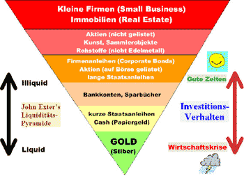 Links sehen Sie die Liquiditäts-Pyramide von John Exter. Alle Anlagen im roten Bereich (ganz oben) verlieren ganz massiv an Wert, wenn Alles in Richtung Liqudität (nach Unten) flüchtet.