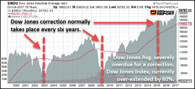 Ausgehend von dem Wirtschaftszyklus, der etwa alle sechs Jahre zu einem Rückgang führt, ist eine gute alte Korrektur beim Dow Jones schon längst überfällig. Wenn wir annehmen, dass der Aktienindex bei einer normalen Korrektur auf etwa 8.000 Punkte fällt, ist er aktuell mindestens 60% überbewertet. Und das ist nur der Anfang.