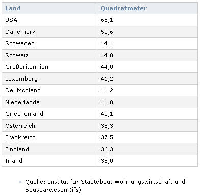 1945 gab es in Deutschland kriegsbedingt eine extreme Knappheit an Wohnfläche. Das hat sich in der Zwischenzeit mehr als ausgeglichen. Hier die Wohnfläche pro Einwohner für einige westliche Länder: