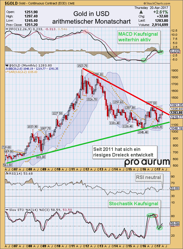 Sollten die Bullen hier erneut scheitern, wäre auf der Unterseite innerhalb des Dreiecks locker Platz bis ca. 1.180 USD und sogar tiefer. Allerdings ist der Goldpreis schon weit in das Dreieck hineingelaufen, so dass ein weiterer Test der unteren Begrenzung nicht mehr notwendig erscheint. Auch sind auf dem Monatschart derzeit keine negativen Signale auszumachen, denn sowohl der MACD-Indikator als auch der Stochastik-Oszillator überzeugen mit Kaufsignalen.
