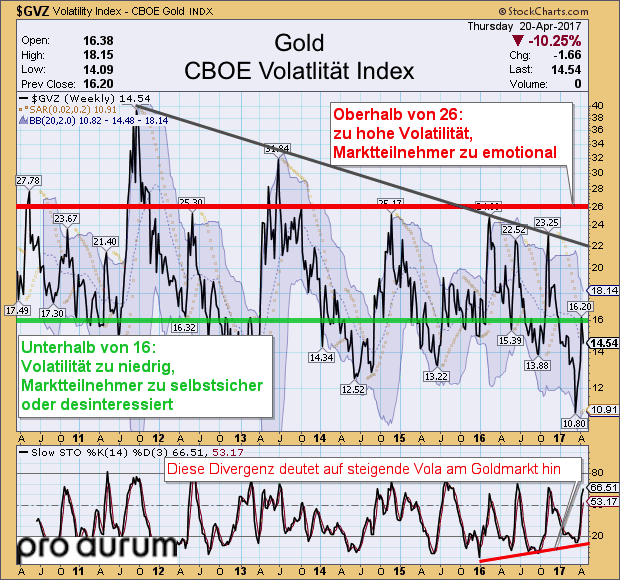 In Verbindung mit der Divergenz bei der Stochastik lässt sich nun schlussfolgern, dass die Volatilität im weiteren Jahresverlauf stark ansteigen wird! Damit ist zwar noch nicht die grundsätzliche Trendrichtung definiert, es braut sich am Goldmarkt aber zunehmend Dynamik zusammen. Besonders für Optionsgeschäfte und Marginspekulanten wird es dann ungemütlicher. Aber auch dem einfachen Anleger werden die starken Schwankungen auf den Magen schlagen.
