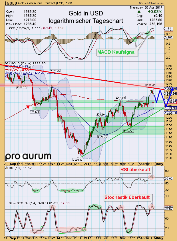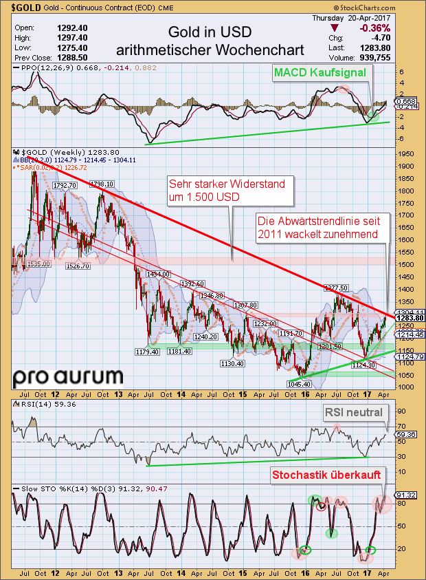 Nachdem der Goldpreis Ende Februar noch erwartungsgemäß an der 200-Tagelinie (1.260 USD) scharf nach unten abgeprallt war, konnten sich die Bullen im März schnell wieder an diesen wichtigen Durchschnitt herantasten. Nach einer mehrwöchigen Konsolidierung zwischen 1.240 und 1.260 USD kam es vor Ostern schließlich zum Ausbruch über 1.265 USD und in der Folge sofort zu einem steilen Anstieg bis auf 1.294 USD. Hier verläuft nun die entscheidende sechsjährige Abwärtstrendlinie, deren Widerstand mit jedem weiteren Angriff aufgeweicht wird.