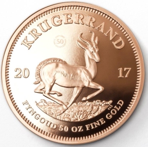Riesige Goldmünzen mit bis zu 1,6 Kilogramm Gewicht und neue Krügerrand-Münzen aus Silber und PlatinJohannesburg, Südafrika, 10. Mai 2017 – Zum Anlass ihres 50. Jubiläums wurde die weltweit beliebteste und meistverkaufte Anlagemünze, der südafrikanische Krügerrand, erstmals in außergewöhnlichen Gewichtseinheiten und aus verschiedenen Edelmetallen hergestellt. Das Vorzeigestück im Jubiläumssortiment ist eine beeindruckende 50-Unzen-Krügerrand-Münze mit einem Gewicht von etwa 1,6 Kilogramm. Diese besondere Münze ist streng auf 50 Einzelstücke limitiert und wird auch als Teil von fünf höchst exklusiven Jubiläumssets erhältlich sein. Der reine Materialwert dieser besonderen Stücke liegt bei EUR 57.987 (Stand 10. Mai 2017: Tagesgoldpreis bei 36.241,93 EUR/ Kg).