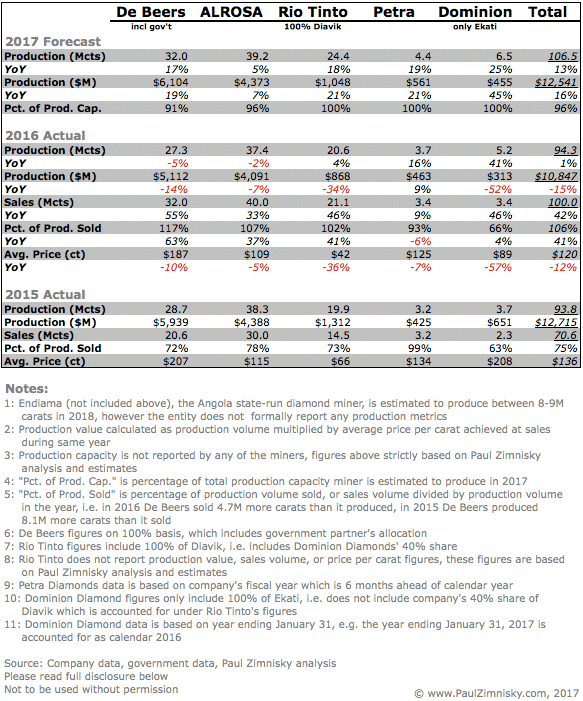 Tabelle 1: Produktions- und Verkaufszahlen der fünf größten Diamantproduzenten für 2015, 2016 und 2017 (geschätzt)