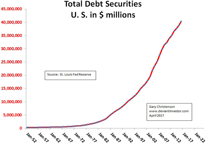 Schulden und Kredite sind der Motor der Weltwirtschaft. Wir nehmen Kredite auf, um wichtige, essentielle Dinge des Lebens zu kaufen. Alle Banknoten repräsentieren Schulden: US-Dollar-Scheine stellen beispielsweise die Schulden der Notenbank Federal Reserve dar. Und alle auf Schulden basierenden Vermögenswerte bergen ein Gegenparteirisiko.Sehen wir uns den ersten Chart an. Die Zweigstelle der Federal Reserve in St. Louis veröffentlicht regelmäßig Daten zum Gesamtwert aller ausgegebenen Schuldverschreibungen in den Vereinigten Staaten, in Millionen Dollar. Sie werden bemerken, dass sich das Schuldenwachstum nach 1971 stark beschleunigt hat, als Präsident Nixon durch die Aufhebung der Goldbindung des Dollars dessen rasante Entwertung begünstigte.