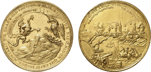 Abb. 6: Habsburg, Leopold I. (1657-1705), Goldmedaille zu 10 Dukaten 1686 auf die Einnahme von Buda durch die Österreicher nach der erfolglosen Belagerung Wiens durch die Türken.