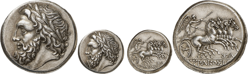 Die oben geschilderte Tendenz hin zu seltenen und sehr gut erhaltenen Sammlermünzen lässt sich durch alle Bereiche der Numismatik verfolgen, sei es Antike, Mittelalter oder Neuzeit. Überhaupt sind vor allem historische Goldmünzen derzeit sehr beliebt. Bestes Beispiel hierfür sind zwei antike Münzen. Das ästhetisch äußerst ansprechende 16 Litren-Stück aus der griechischen Stadt Syrakus auf Sizilien zeigt auf dem Avers einen sehr markanten Kopf des Göttervaters Zeus, auf dem Revers lenkt die Siegesgöttin Nike eine Quadriga (Abb. 8). Sehr begehrt war auch ein Aureus, eine römische Goldmünze, die Kaiser Septimius Severus und seine Gemahlin Julia Domna zeigt (Abb. 9).