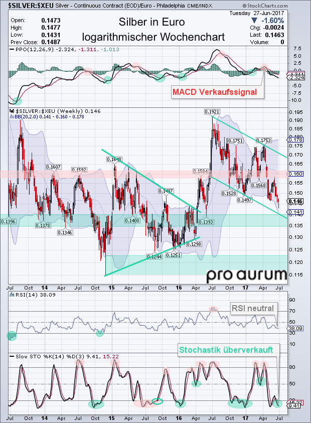 Auf der Oberseite wartet auf die Euro-Silberbullen um die Marke von 16,00 EUR die erste ernsthafte Herausforderung. Gelingt es Ihnen diesen Widerstand zu überwinden, wäre Platz bis ca. 16,80 - 17,00 EUR. Hier verläuft die obere Begrenzung des Abwärtstrendkanals.