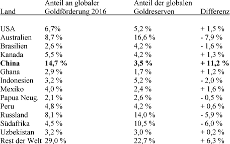 Gemäß dem aktuellen Gold-Bericht der USGS (staatlich geologische Behörde der USA [1]), hat China im letzten Jahr 455 Tonnen Gold gefördert. Die chinesischen Gold-Reserven werden hingegen mit nur 2.000 Tonnen angegeben. D. h. China hat angeblich in einem Jahr knapp 1/4 seiner Reserven ausgebeutet. Prozentual bedeutet dies, dass das Land 14,7% zur globalen Goldförderung von 3.100 t beigetragen hat, obwohl es nur 3,5% der globalen Reserven besitzt (eben jene 2.000 t). Die folgende Tabelle listet diese beiden Kennzahlen und deren Differenz für die größten Goldförderländer auf (Datenquelle USGS [1], eigene Berechnungen).