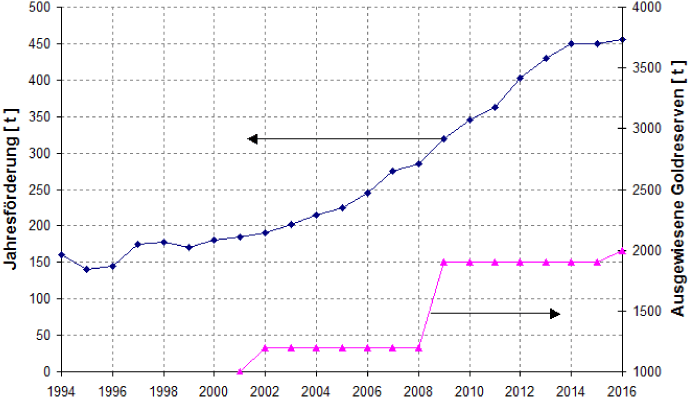 Abb. 1: Chinesische Goldförderung (blau, linke Skala) und ausgewiesene Reserven (magenta, rechte Skala) 1994 - 2016.