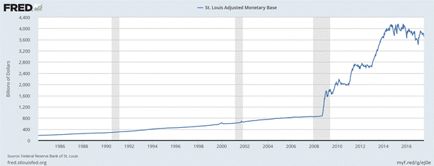 Während dieser Zeit explodierte die Geldbasis in den Vereinigten Staaten und die Bilanz der Federal Reserve wuchs innerhalb weniger Jahre von 800 Milliarden $ auf 4 Billionen $ an. Die US-Notenbanker verabreichten dem System mit Hilfe eines als "quantitative Lockerungen" (QE) bekannten Prozesses gigantische Geldspritzen. Doch nicht nur die Fed schlug diesen Kurs ein. Fast alle Zentralbanken, insbesondere jedoch die Bank of Japan und die EZB, taten es ihr gleich.