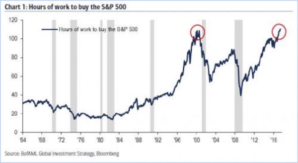 Beginnen wir mit einem Chart der Bank of America. Sehen Sie sich an, wie viele Stunden ein durchschnittlicher Angestellter arbeiten muss, um einen Anteil am US-Aktienindex S&P 500 kaufen zu können. Verblüffend. Hut ab gegenüber den Analysten der Bank, die diese Daten aufbereitet haben.