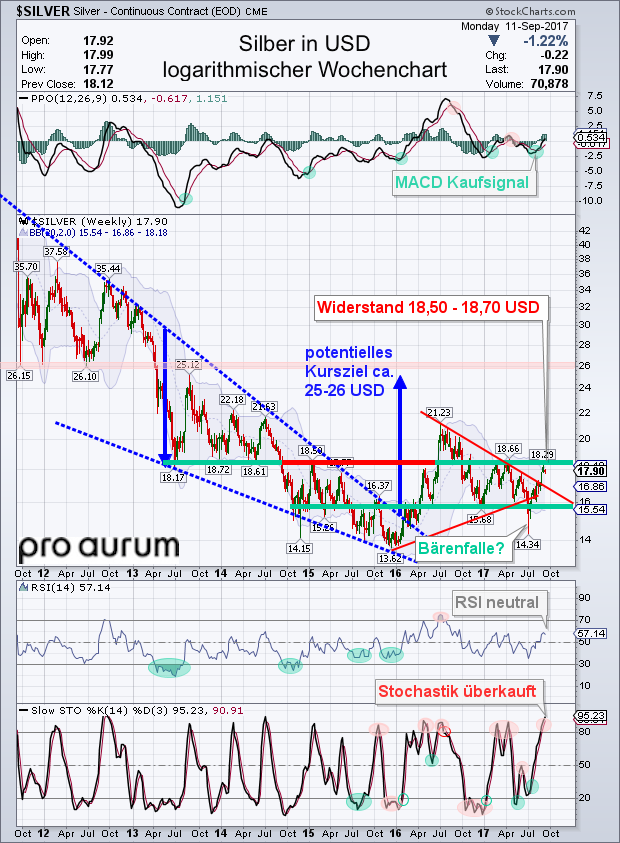 In den letzten Tagen konnte der Silberpreis die horizontale obere Begrenzung des Seitwärtskanals um 18,50 USD auf dem Wochenchart mehr oder weniger erreichen. Gleichzeitig wurde allerdings das obere Bollinger Band (18,18 USD) kurzzeitig leicht überschritten, womit die Luft automatisch sehr dünn geworden ist. Der bislang überschaubare Rückfall in den letzten zwei Handelstagen war daher logisch und zu erwarten.