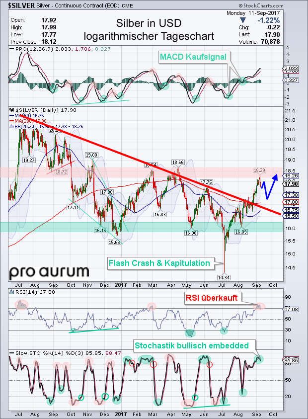 Mit dem schwachen Wochenauftakt ist die Wahrscheinlichkeit für einen Rücksetzer in Richtung 17,00 USD nun aber deutlich gestiegen. Vermutlich wird der Silberpreis daher in den nächsten Tagen die ehemalige Abwärtstrendlinie von oben testen. Im Anschluss wäre eine weitere Attacke auf die Widerstandszone um 18,50 USD zu erwarten. Gelingt der Ausbruch über 18,50 USD ist der Weg bis zum Hochpunkt vom Sommer 2016 bei 21,23 USD frei.