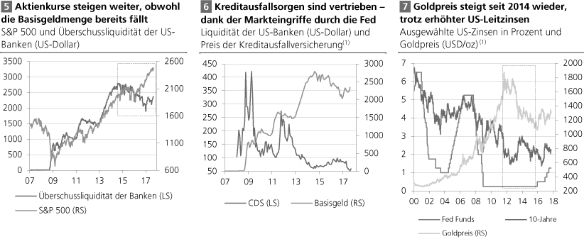 Die Fed kann daher die Leitzinsen (leicht) anheben und die Überschussliquidität im Bankenapparat reduzieren, ohne das Wirtschafts- und Finanzmarktgeschehen durcheinander zu bringen: Solange die Investoren zuversichtlich sind, dass die Fed, sollte sich die Lage plötzlich eintrüben, wieder zu ihrer "Rettungspolitik" greift, bleibt ihre Risiko- und Investitionsfreude erhalten, selbst wenn jetzt die Fed ihr großes Experiment rückabzuwickeln scheint.(*)