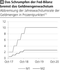 Wenn die Fed ihren Plan in die Tat umsetzt, werden zunächst kleine und dann immer größere Anleihebeträge fällig, die von der Fed nicht mehr reinvestiert werden; bis Oktober werden es 50 Mrd. US-Dollar pro Monat sein. Reinvestiert die Fed nicht mehr in die Staatsanleihen, schrumpfen Basisund Geschäftsbankengeldmenge (M1 beziehungsweise M2). Bleibt die Reinvestition in Hypothekenanleihen aus, schrumpft nur die Basisgeldmenge. Bezogen auf M1 und M2 wird der Fed-Plan ab Oktober 2017 das jährliche M1-Wachstum um schätzungsweise 10,1 Prozent, das der M2-Geldmenge um knapp 2,6 Prozent verringern. Könnte das zu einem Problem führen?