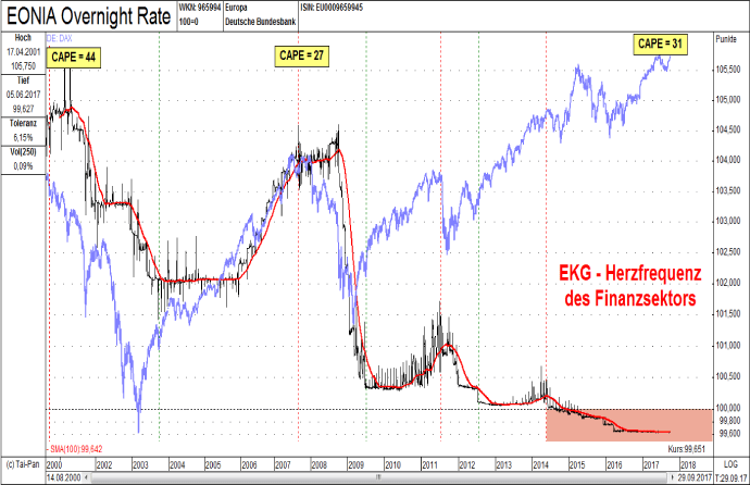Der EONIA ist der Tagesgeldzinssatz, ohne zusätzliche Besicherung, für das Interbankengeschäft. Dieser Zinssatz steigt normalerweise mit dem Anstieg der Börse (Wirtschaft) und fällt auch reziprok mit ihr. Betrachtet man nun die Entwicklung dieser "Finanzherzfrequenz" in den vergangenen 17 Jahren, so zeigt sich, dass ein immer niedrigerer Zins nötig war, um den DAX und somit die Wirtschaft nominal weiter zum Steigen zu bringen.